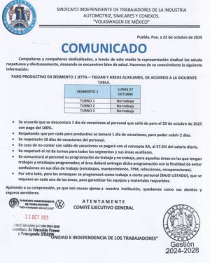 A través de un comunicado el Sindicato Independiente de Trabajadores de la Industria Automotriz Volkswagen, informó que el próximo lunes 27 de octubre se aplicará un paro productivo en el segmento 1 correspondiente a la línea de producción de los modelos Jetta-Tiguan, así como áreas auxiliares.